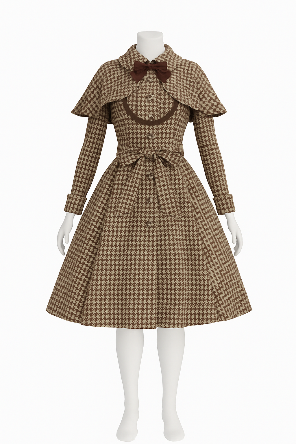 Crafted with precision tailoring, the dress features a cape-style collar, detailed button-down front, and a waist-tie belt that enhances the silhouette. The flawless stitch lines and structured fin