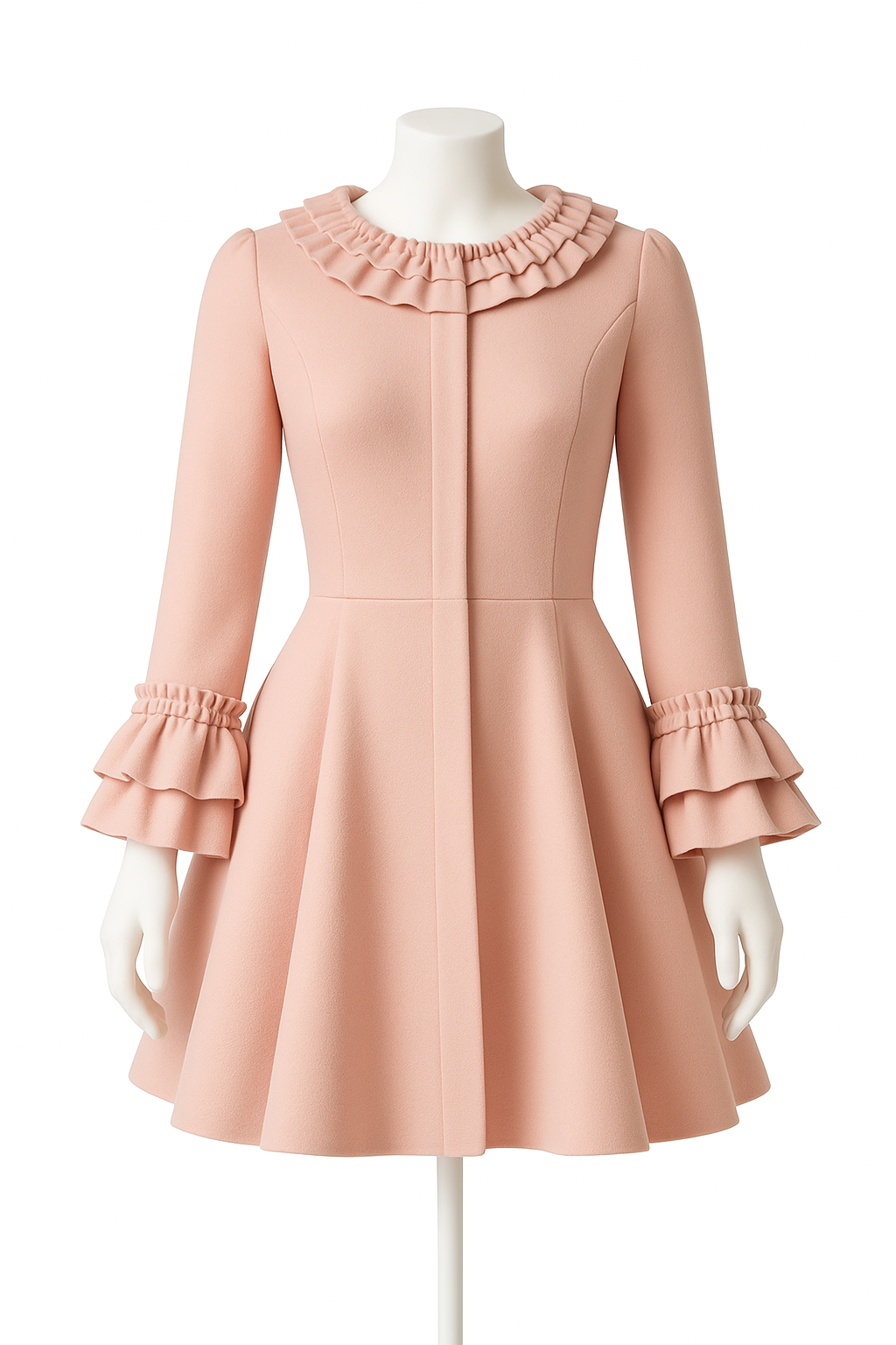 This beautifully tailored design features layered ruffle sleeves, a gathered neckline, and a perfectly structured flare skirt that flows gracefully. The dress highlights fine panel stitching that e