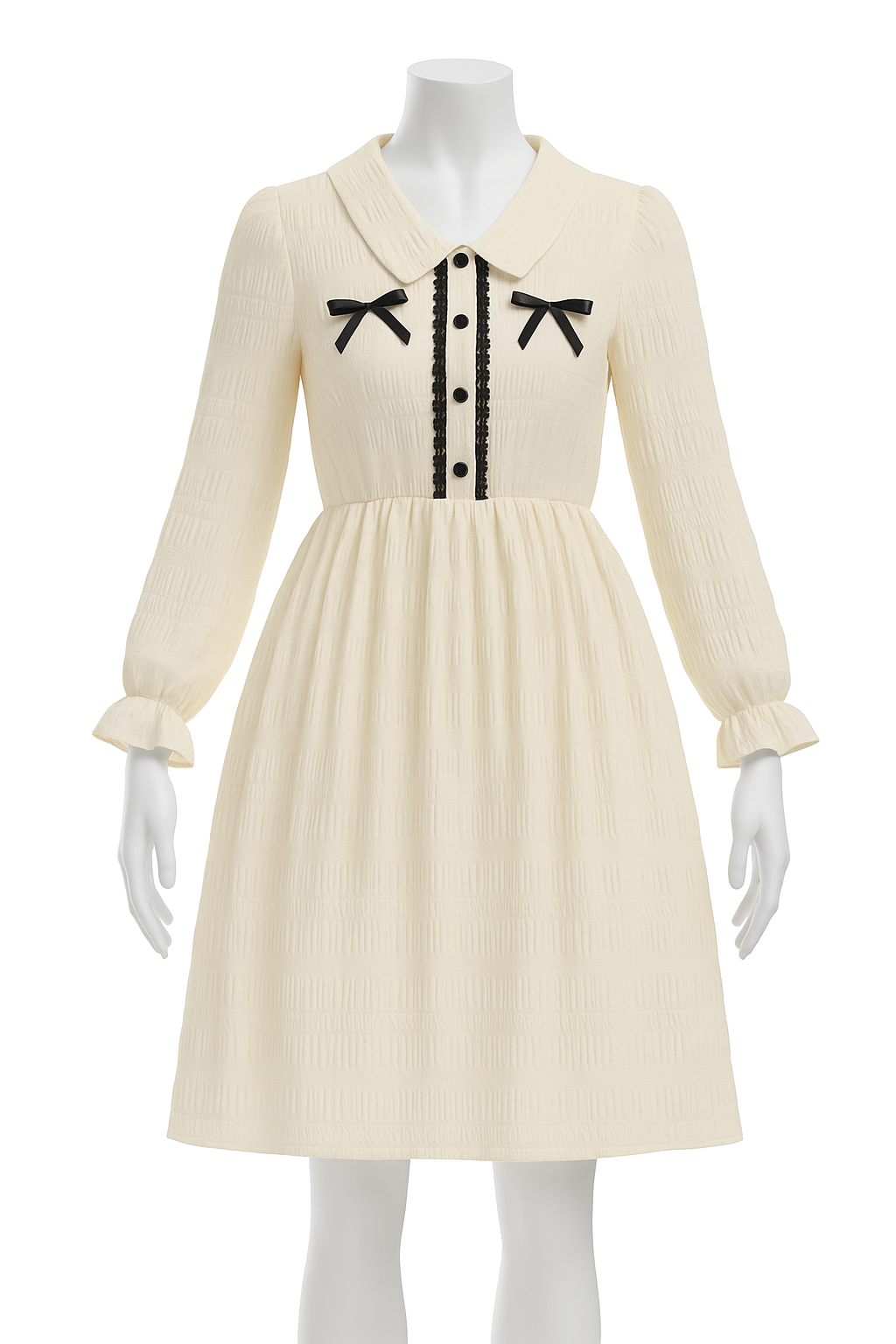 Elegant Cream Textured Dress with Black Bow & Button Detailing | Mehlish Fashion