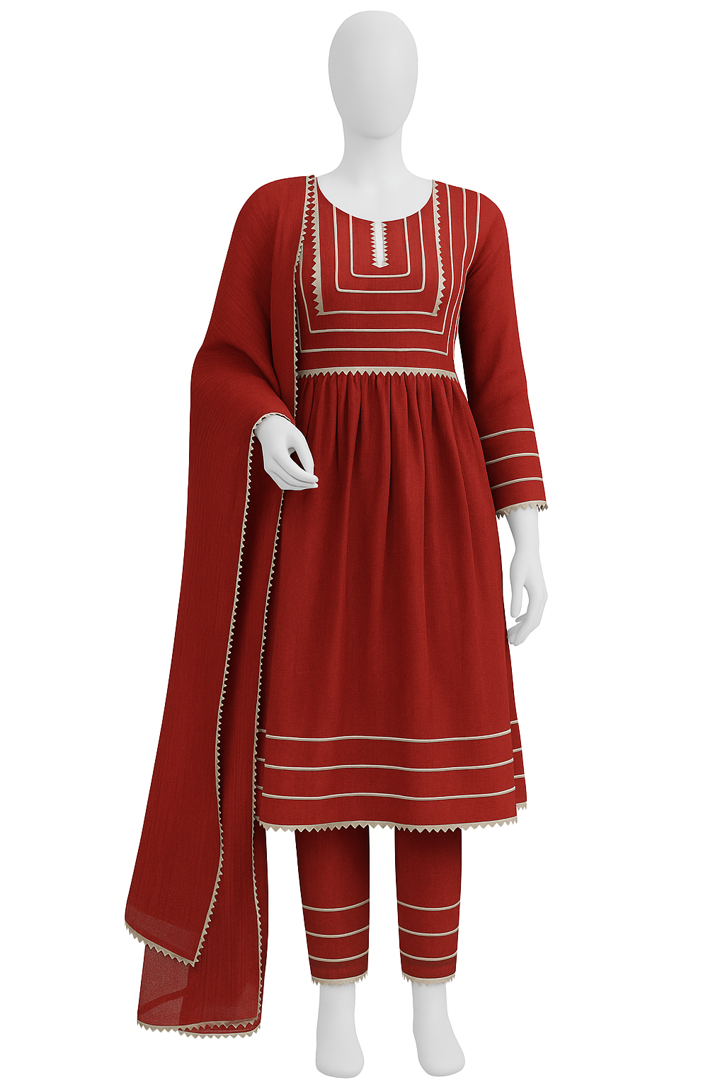 Design Highlights: Geometric lace panel stitching, detailed borders, coordinated three-piece set