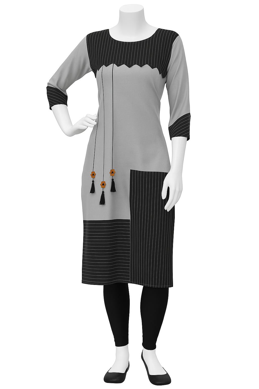 The pinstriped yoke and cuffs, along with decorative hanging tassels with floral motifs