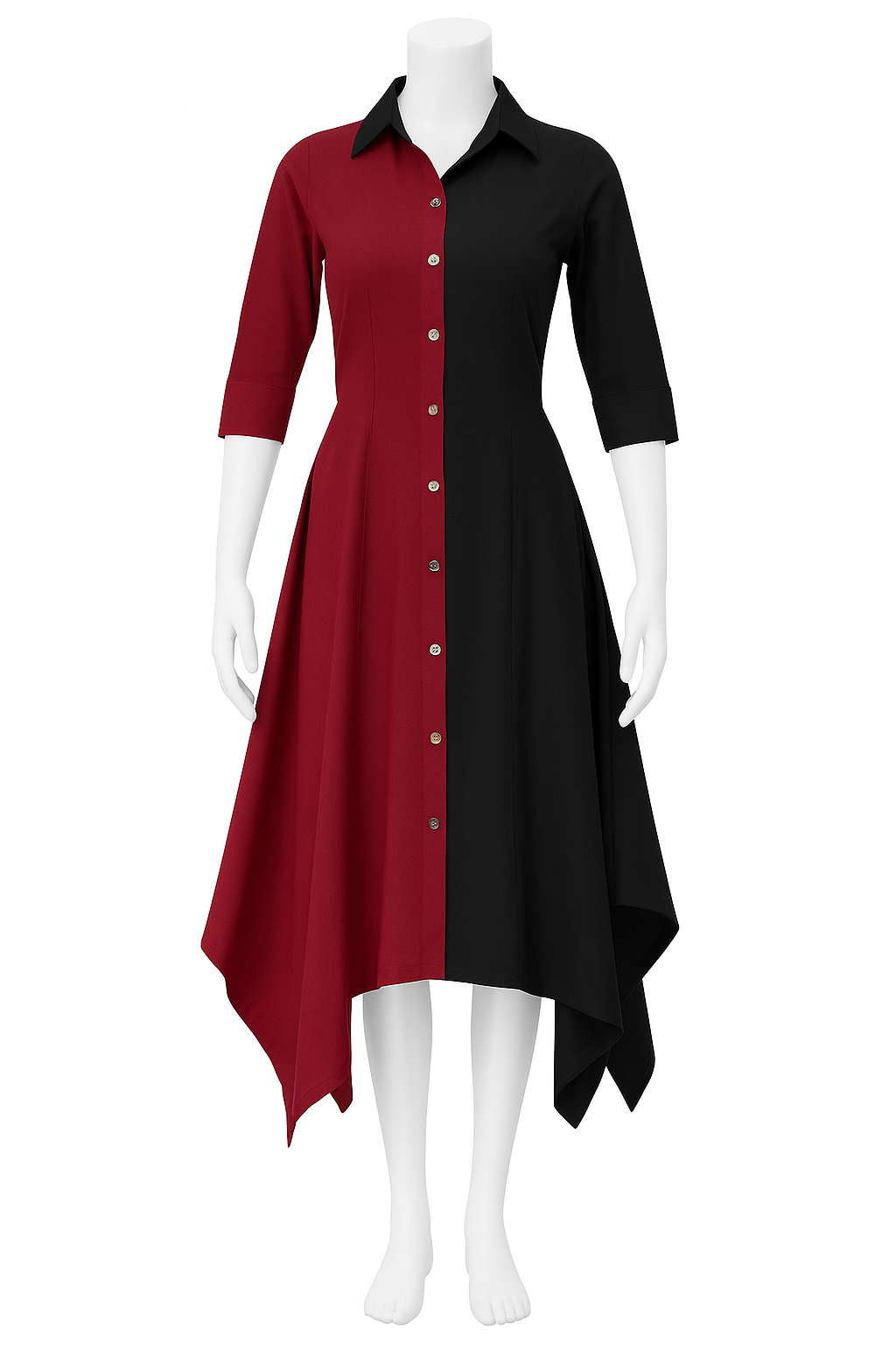 This elegant piece features a dual-color contrast — deep maroon and jet black — divided perfectly along the button-down front.