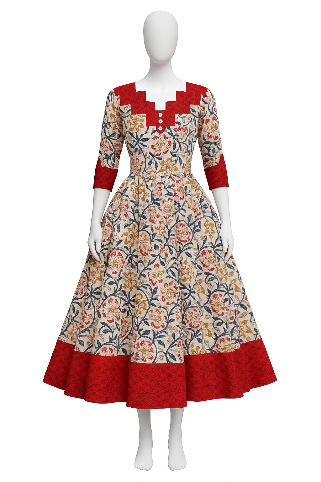 Elegant Handcrafted Floral Anarkali Dress with Contrast Red Detailing | Mehlish Fashion Brand