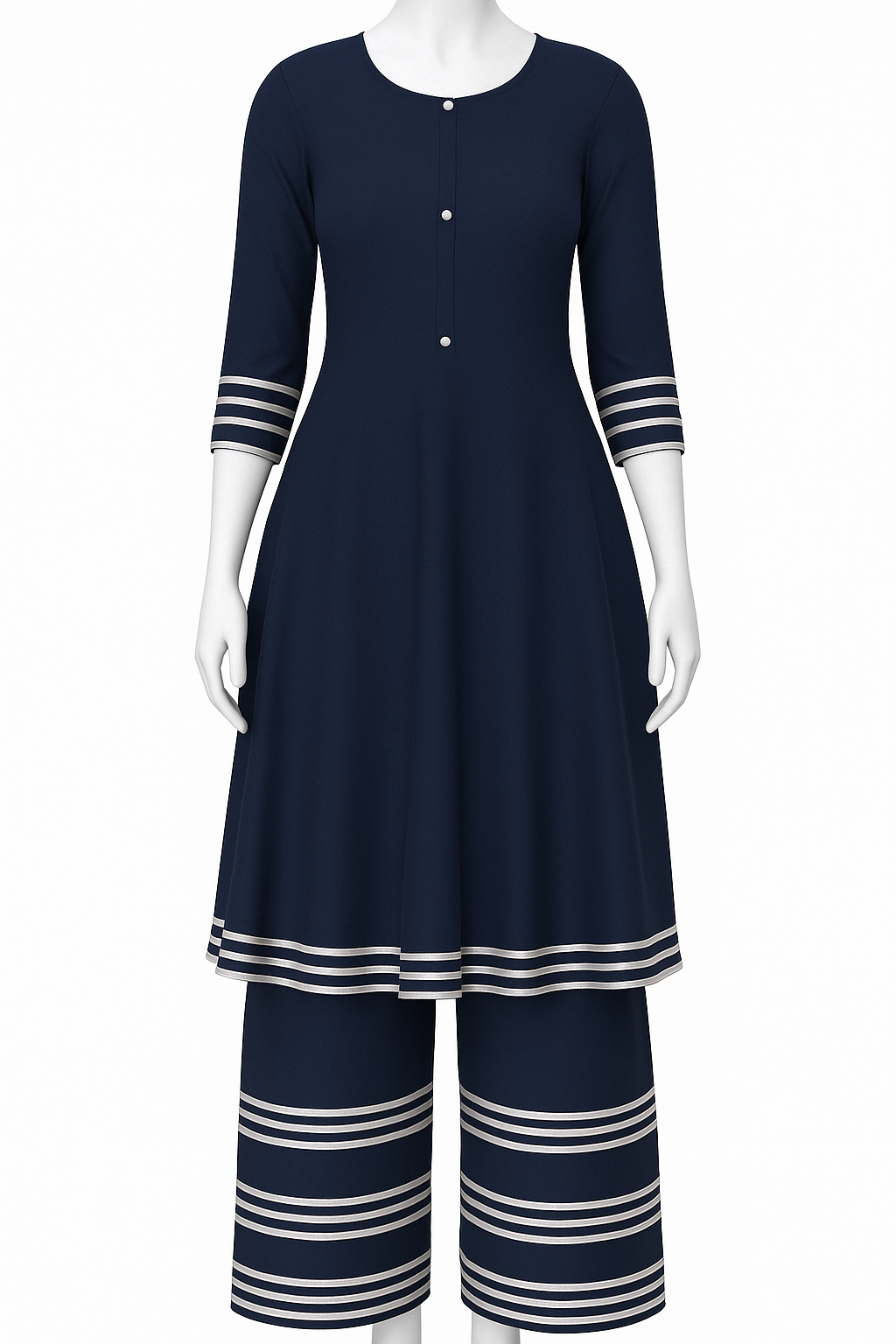 The A-line kurti features delicate silver stripe detailing on the sleeves and hemline, enhancing its flowy design. The wide-leg palazzo pants carry matching horizontal stripes, creating a seamless
