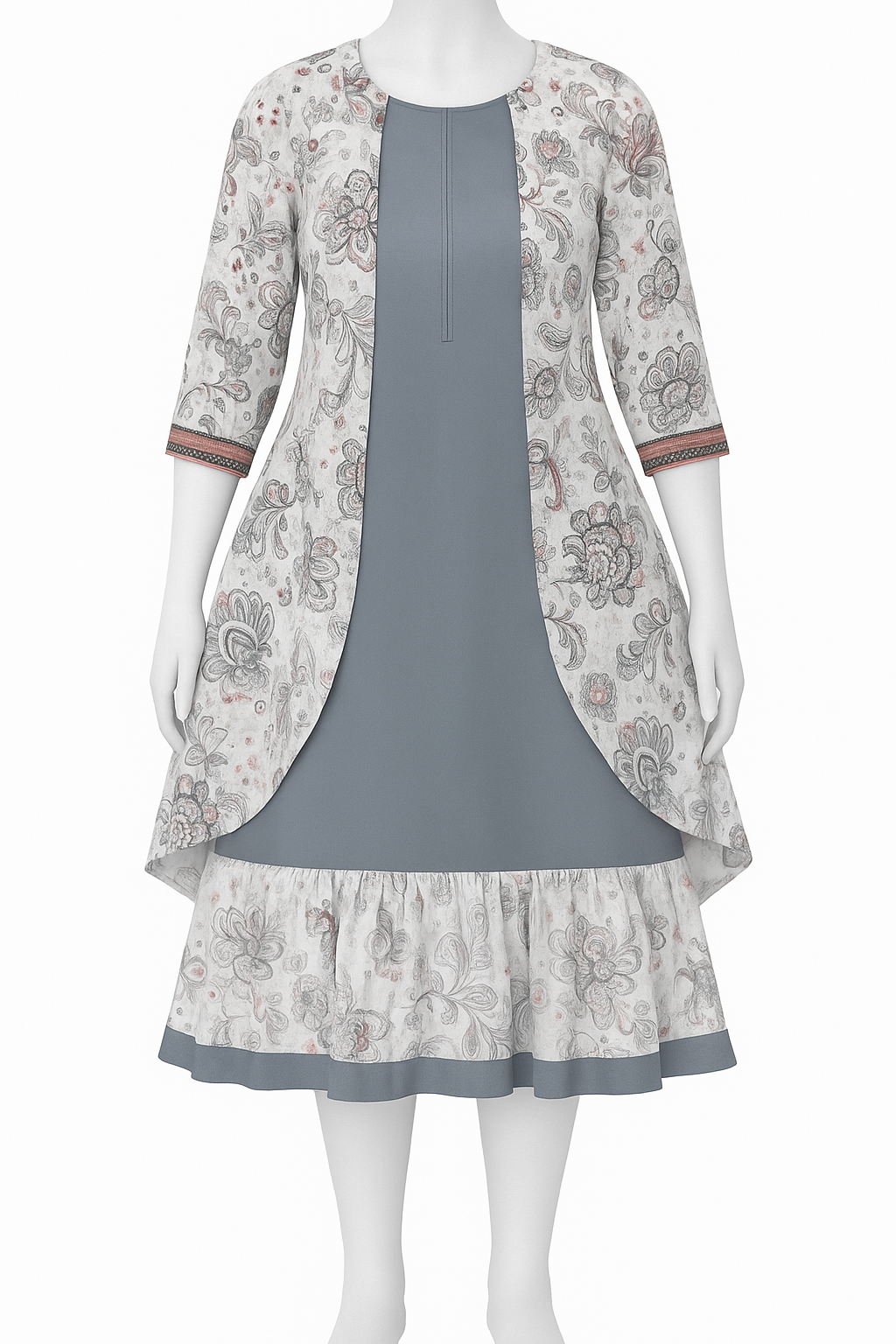 The fine hand-stitching highlights every curve of the design, from the front-open floral layer to the pleated ruffled hemline that enhances its graceful fall. The ¾ sleeves with printed cuff