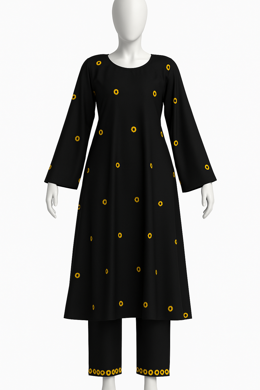 This beautiful black outfit features delicate yellow floral embroidery spread evenly across the fabric, giving it a classy and graceful look. The stitching is done with fine craftsmanship, ensuring