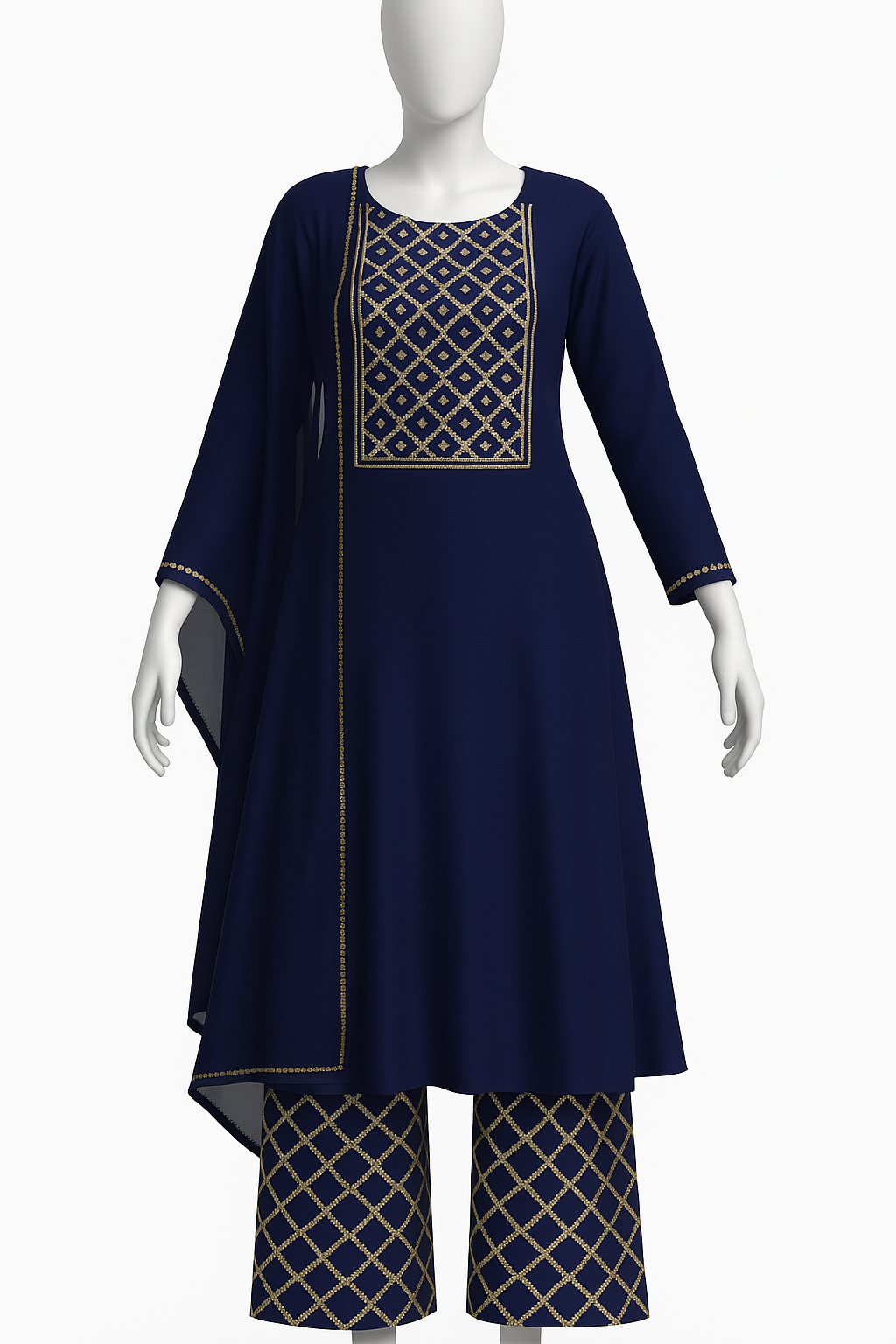 The stitching is finely detailed, with smooth seam lines, perfect fitting, and precision-cut panels that enhance the graceful drape of the fabric. The dupatta is outlined with delicate gold lace de