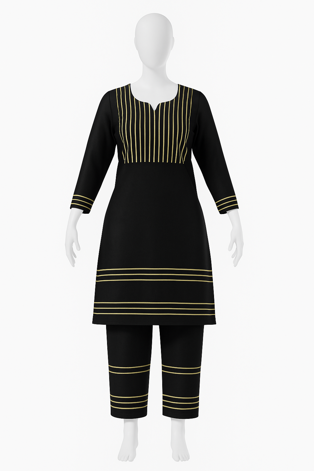 This stunning outfit is made from high-quality jet-black fabric, featuring meticulously stitched golden lines on the neckline, sleeves, and borders. The vertical gold stripes on the upper bodice be