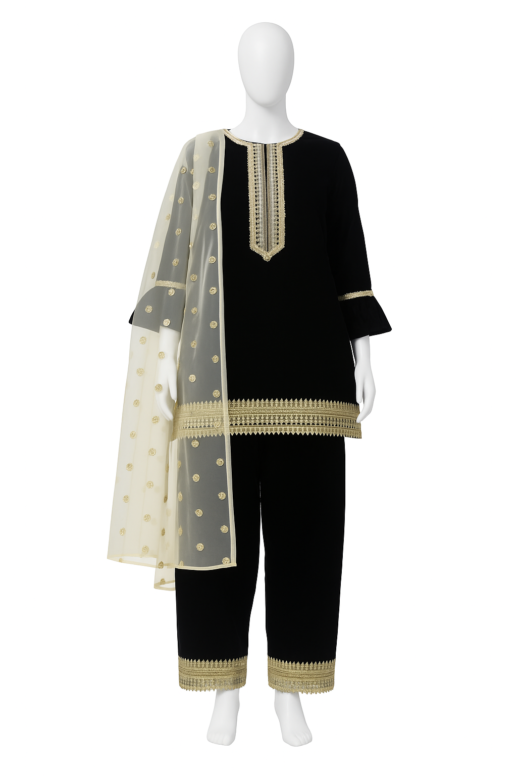 This stunning black velvet short kurti set by Mehlish Fashion Brand showcases timeless elegance and intricate craftsmanship. The outfit features golden hand-stitched lace detailing along the neckli
