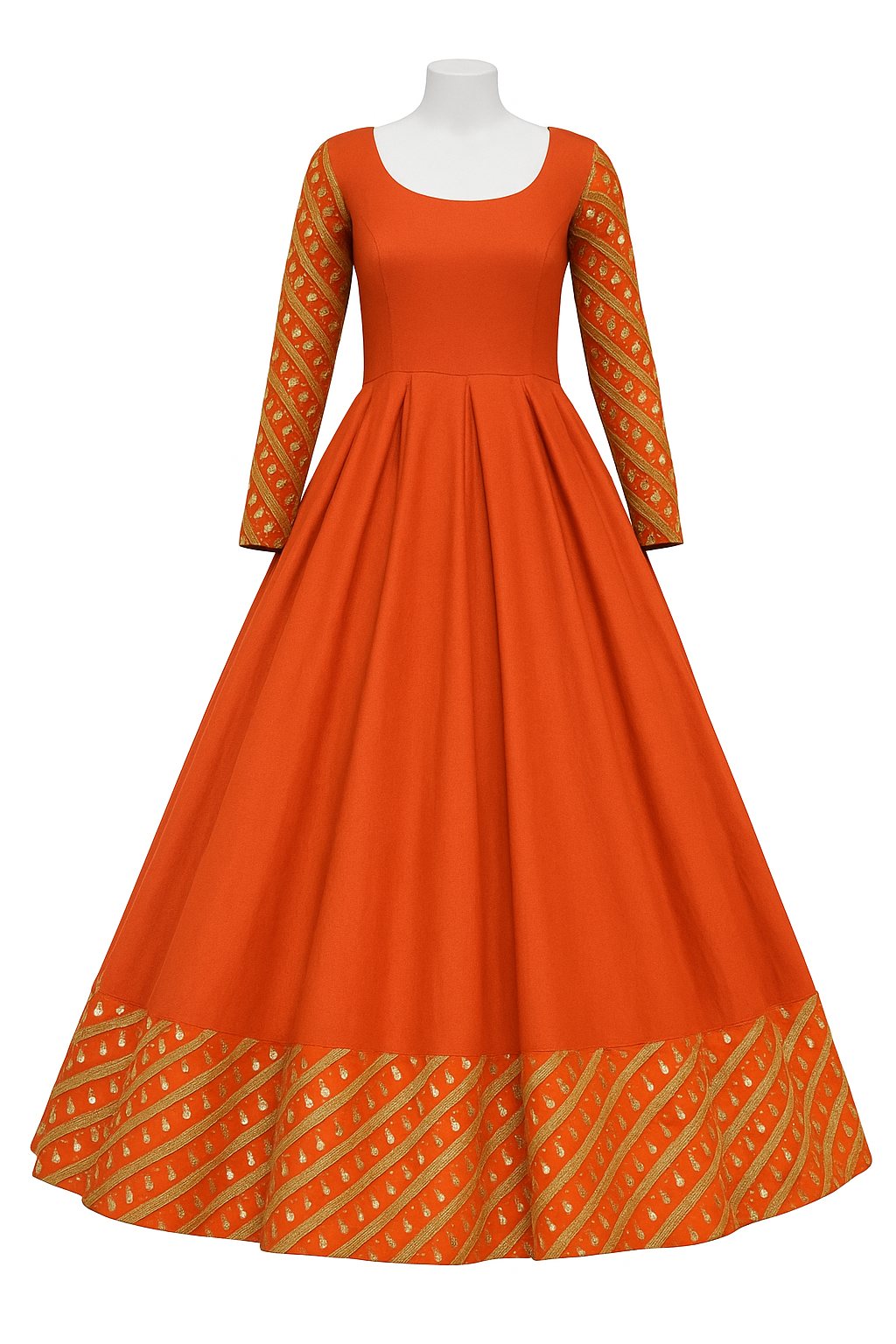 Step into elegance with this vibrant Orange Anarkali Dress from Mehlish Fashion Brand, crafted with expert stitch detailing and flawless finishing.The dress features a luxurious flare that flow