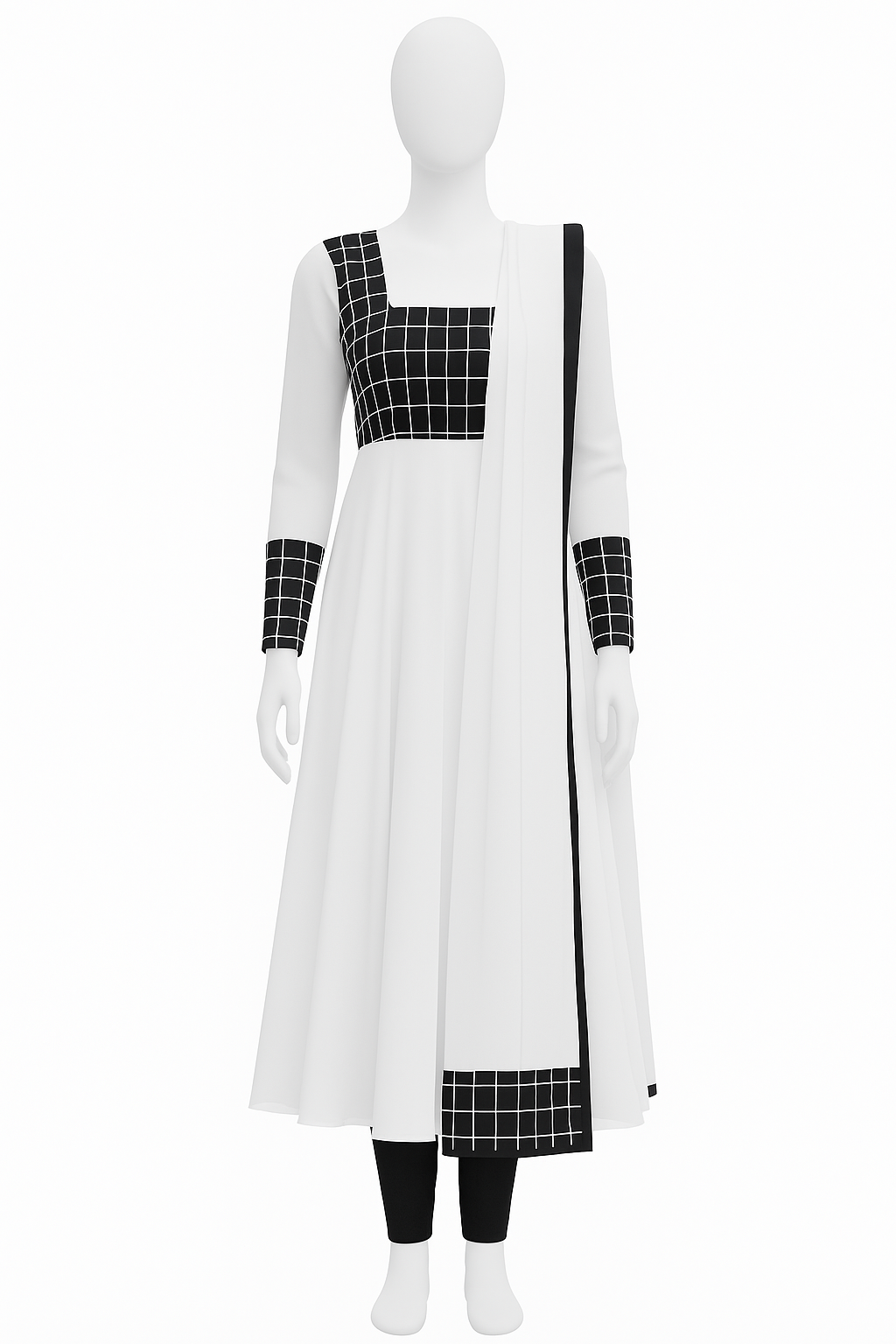 Elegant Black & White Long Dress | Handcrafted Grid Stitch Design by Mehlish Fashion Brand - Buy Now