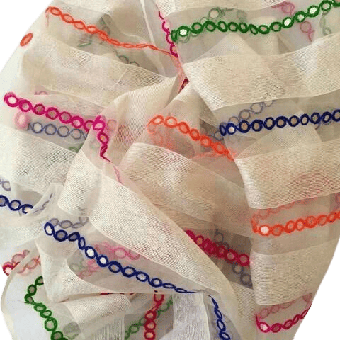 Each row of stitching adds a vibrant touch of blue, pink, orange, and green, giving this dupatta a festive yet graceful look. The fine transparent organza fabric enhances the embroidery details, ma