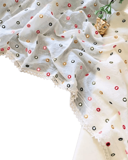 Made from premium-quality white cotton fabric, this dupatta features delicate multi-colored circular stitching in shades of red, mustard, green, and black, giving it a vibrant y