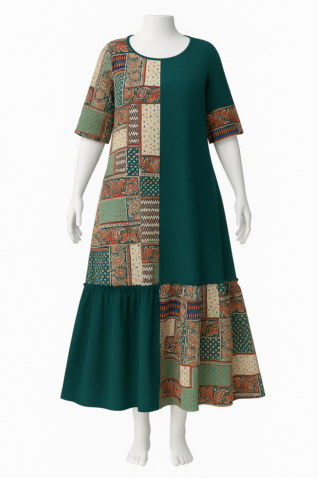 Teal Green Patchwork Maxi Dress | Unique Panel Stitching & Ethnic Print by Mehlish Fashion Brand