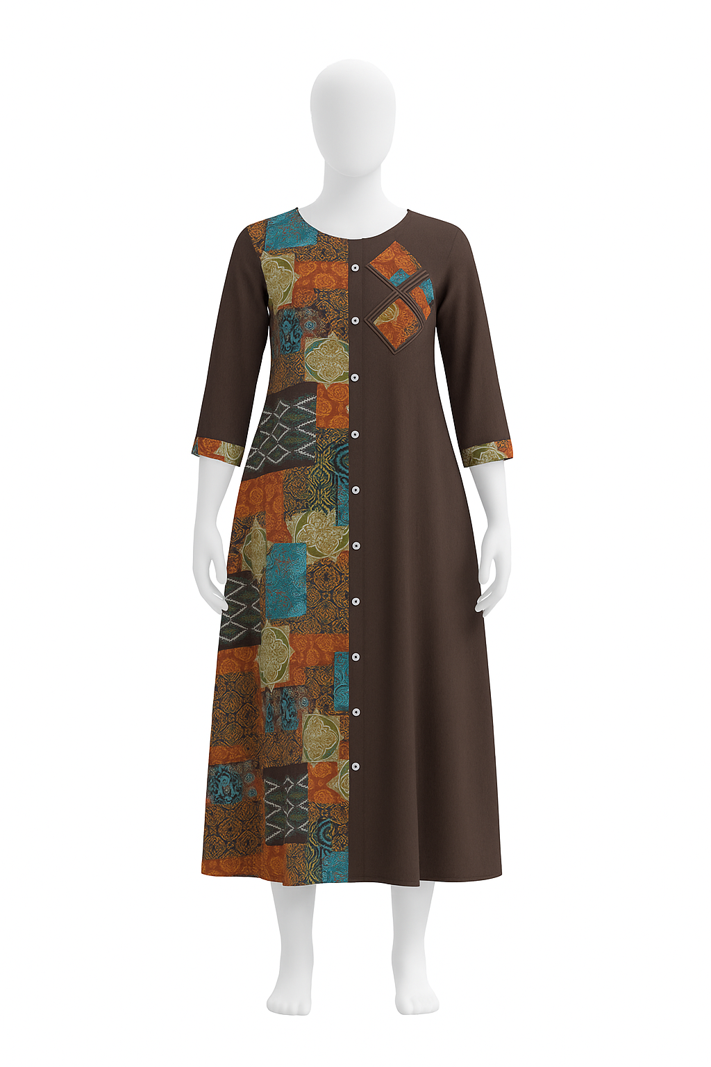 The dress is tailored with precision, highlighting clean front button finishing, perfectly aligned patchwork, and neat cuff detailing.