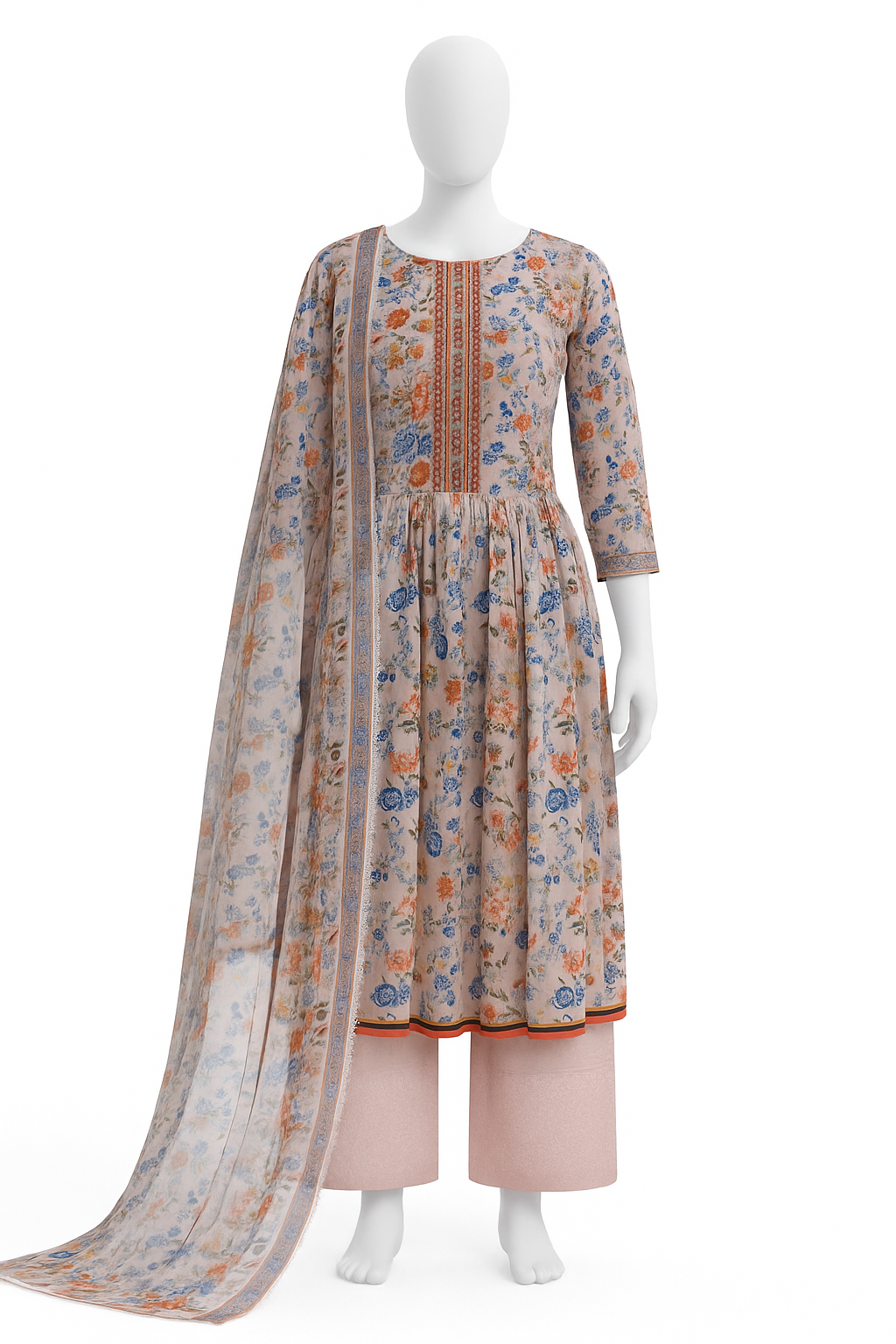 This elegant outfit features a soft pastel base adorned with vibrant floral prints in hues of blue, orange, and coral. The front panel is beautifully stitched with vertical embroidered detailing, e