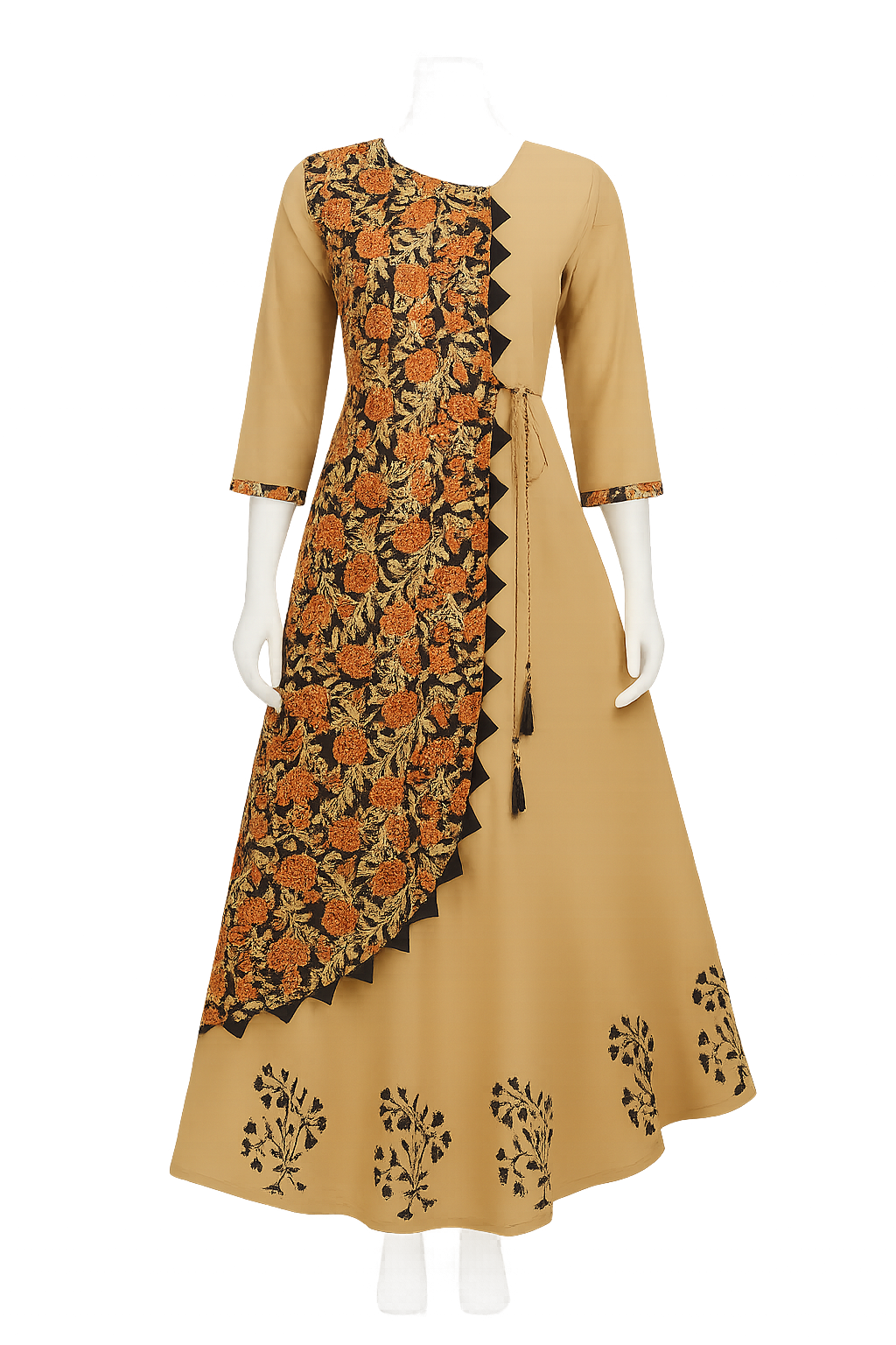 embroidered panel on one side, giving it a refined and modern ethnic look. The delicate triangular cut border stitching enhances its structure, while the fine thread embroidery at the hemline adds