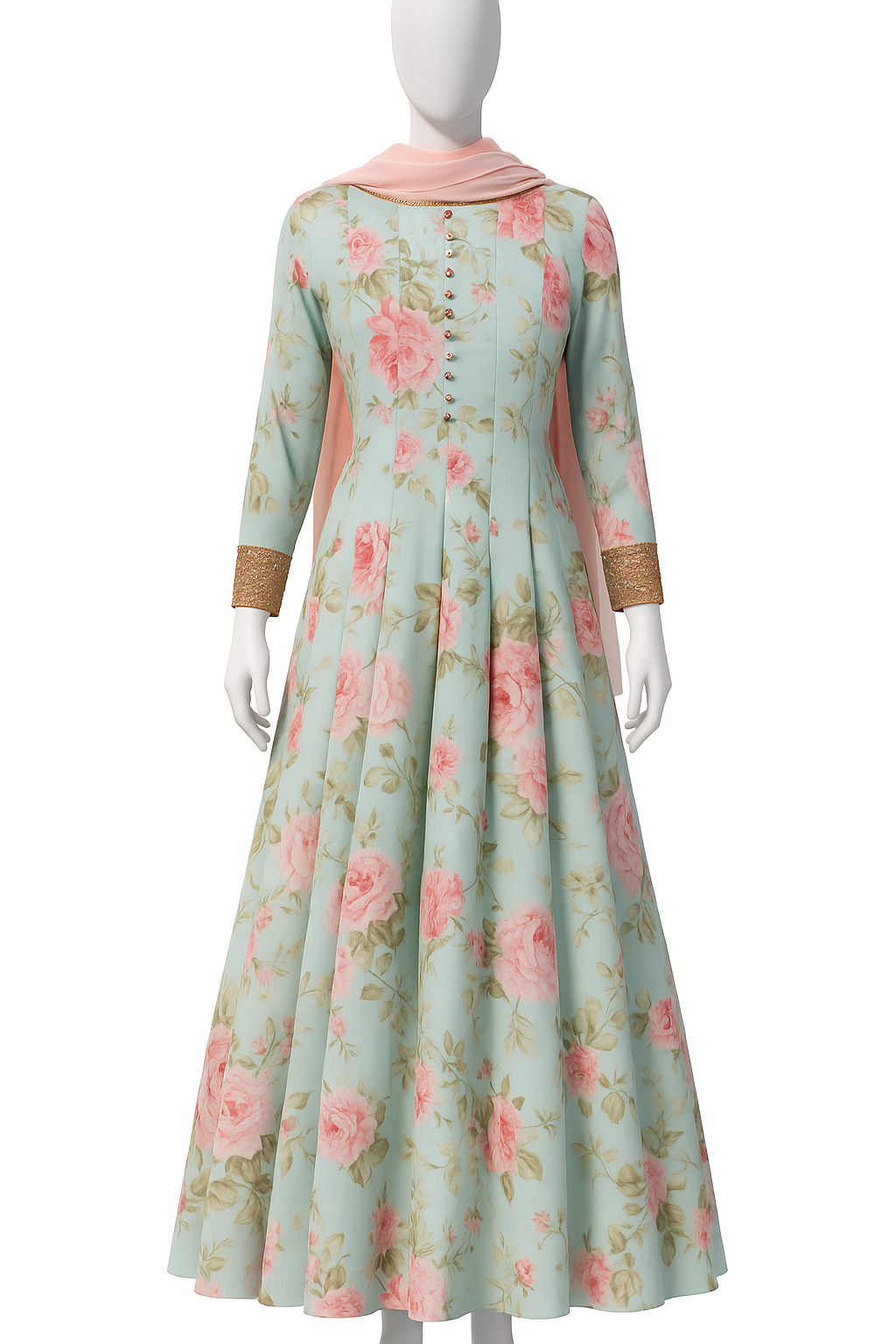 This pastel sky-blue floral maxi dress features delicate rose patterns and fine vertical panel stitching, giving it a perfectly structured yet flowy silhouette. The front is enhanced with hand-fini