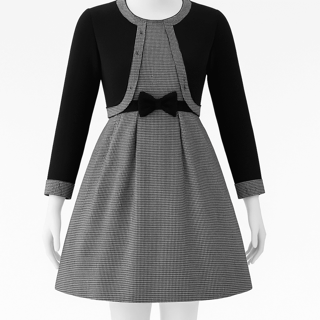 This elegant dress features a contrasting black bolero-style upper paired with a micro-checkered grey skirt, crafted with precise stitching and clean finishing lines. The center bow accent adds a t