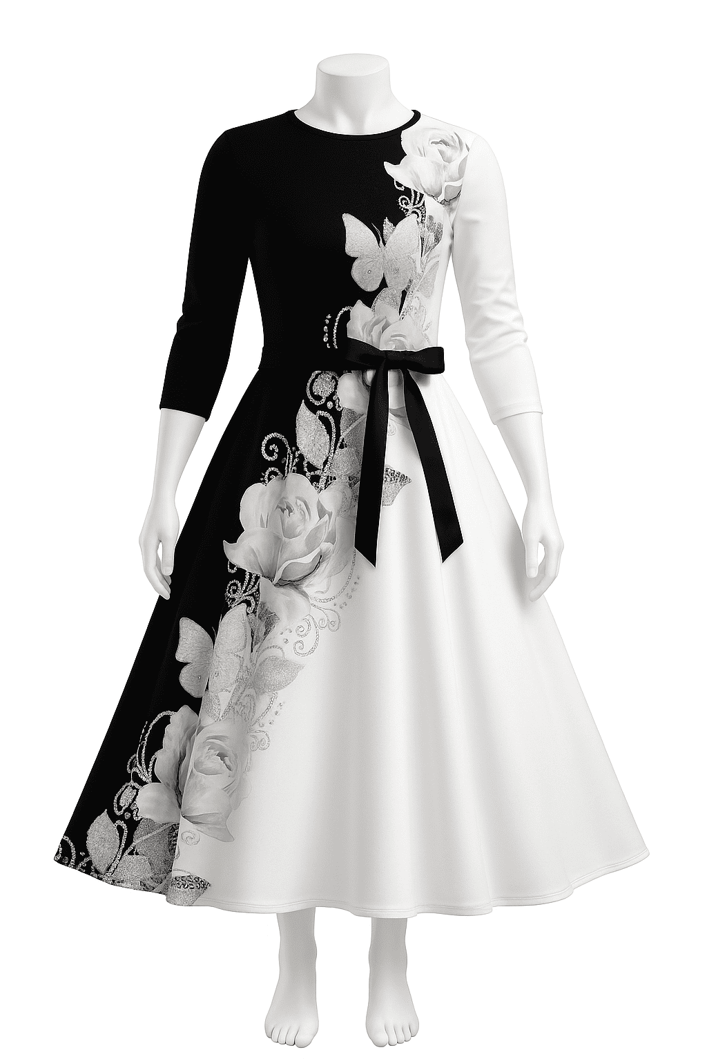 Elegant Black & White Contrast Dress with Floral Embroidery and Butterfly Stitch Detailing | Mehlish Fashion Brand - Buy Now
