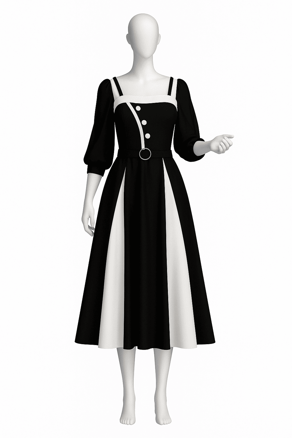 This black-and-white contrast dress features precise panel stitching, soft net sleeves, and a belted waistline that enhances the silhouette with refined grace. The asymmetrical button line and cris