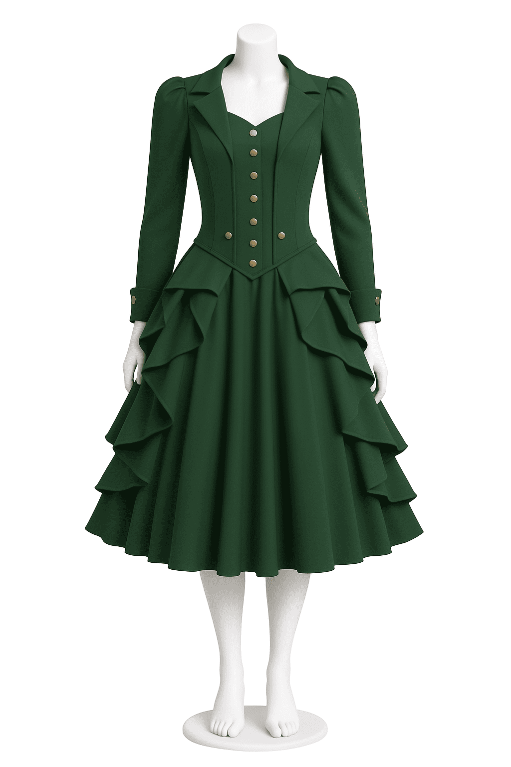 The dress features a structured bodice with precision panel stitching, giving a perfectly fitted silhouette. The gold button accents enhance the classic charm, while the layered ruffle skirt is bea